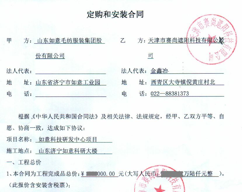 賽尚遮陽與山東如意毛紡服裝集團(tuán)股份有限公司于2017年7月簽訂了如意集團(tuán)研發(fā)中心電動(dòng)窗飾遮陽項(xiàng)目,應(yīng)用的產(chǎn)品為電動(dòng)香格里拉簾,應(yīng)用面積約2700平米。