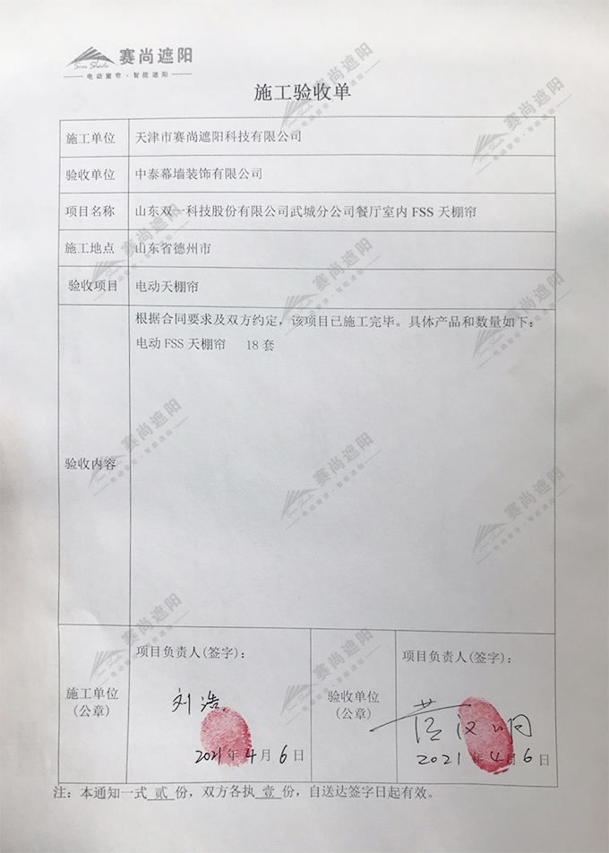 山東雙一科技采光頂天棚簾遮陽工程項目驗收完工