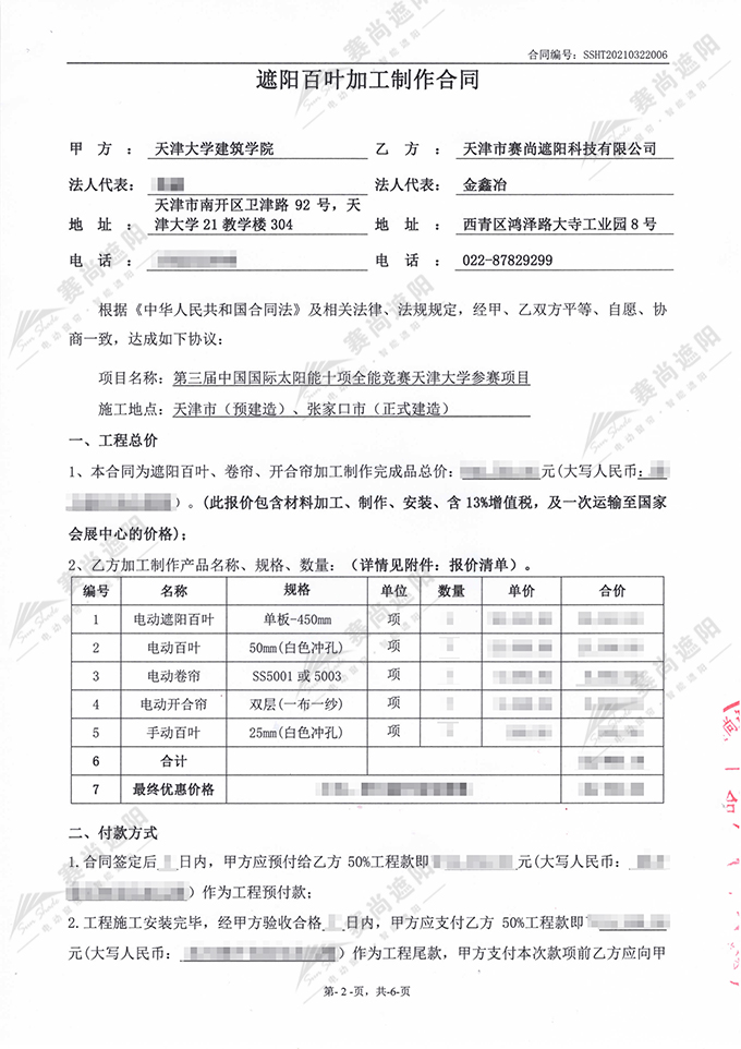 新簽合同:天津大學(xué)建筑學(xué)院遮陽百葉加工制作合同