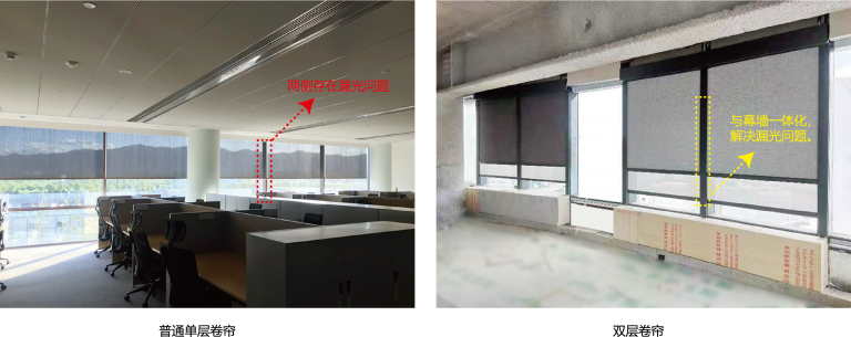 無論是從圖紙設計的角度,還是產(chǎn)品方面,我個人比較傾向雙層立面防風卷簾,一層透光面料,一層遮光面料。隨著人們對遮陽需求的高度重視,對于室內(nèi)的光亮度要求也是日益提高,在夜間時室內(nèi)的人往往需要遮光較好的卷簾,從而提供一個舒適的睡覺環(huán)境;而在白天外界的光亮度過高時,白天室內(nèi)活動的人往往希望一個比較低的光亮度,防止強光炫目的同時又能滿足工作時照明的需要,此時普通的單層卷簾就不能同時滿足白天和夜間兩種形式的遮光效果,這樣我們就會去研發(fā)新型的遮陽產(chǎn)品,雙層電動卷簾,它獨有的特性就是能與幕墻完美貼合在一起,實現(xiàn)幕墻一體化,方能解決如兩側(cè)不夠密封,遮光效果不佳,還需安裝遮光邊槽等等來解決漏光問題。