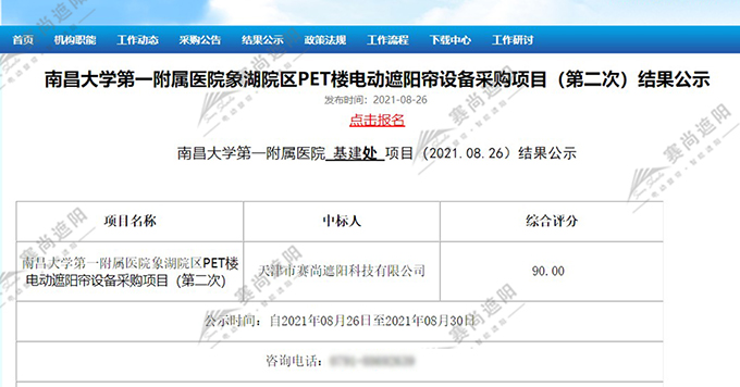 前段時(shí)間,南昌大學(xué)第一附屬醫(yī)院象湖院區(qū)PET樓電動(dòng)遮陽簾對(duì)外進(jìn)行采購項(xiàng)目招標(biāo),需要解決頂部遮陽問題,現(xiàn)賽尚遮陽已中標(biāo)。