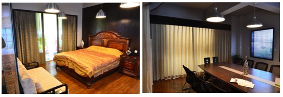 第二個區(qū)域為室內(nèi)窗飾及布藝展示區(qū),模擬家居室內(nèi)場景,主要展示產(chǎn)品為電動百葉簾、電動羅馬簾、電動百褶簾等,還擁有很多的面料樣品,供客戶挑選。