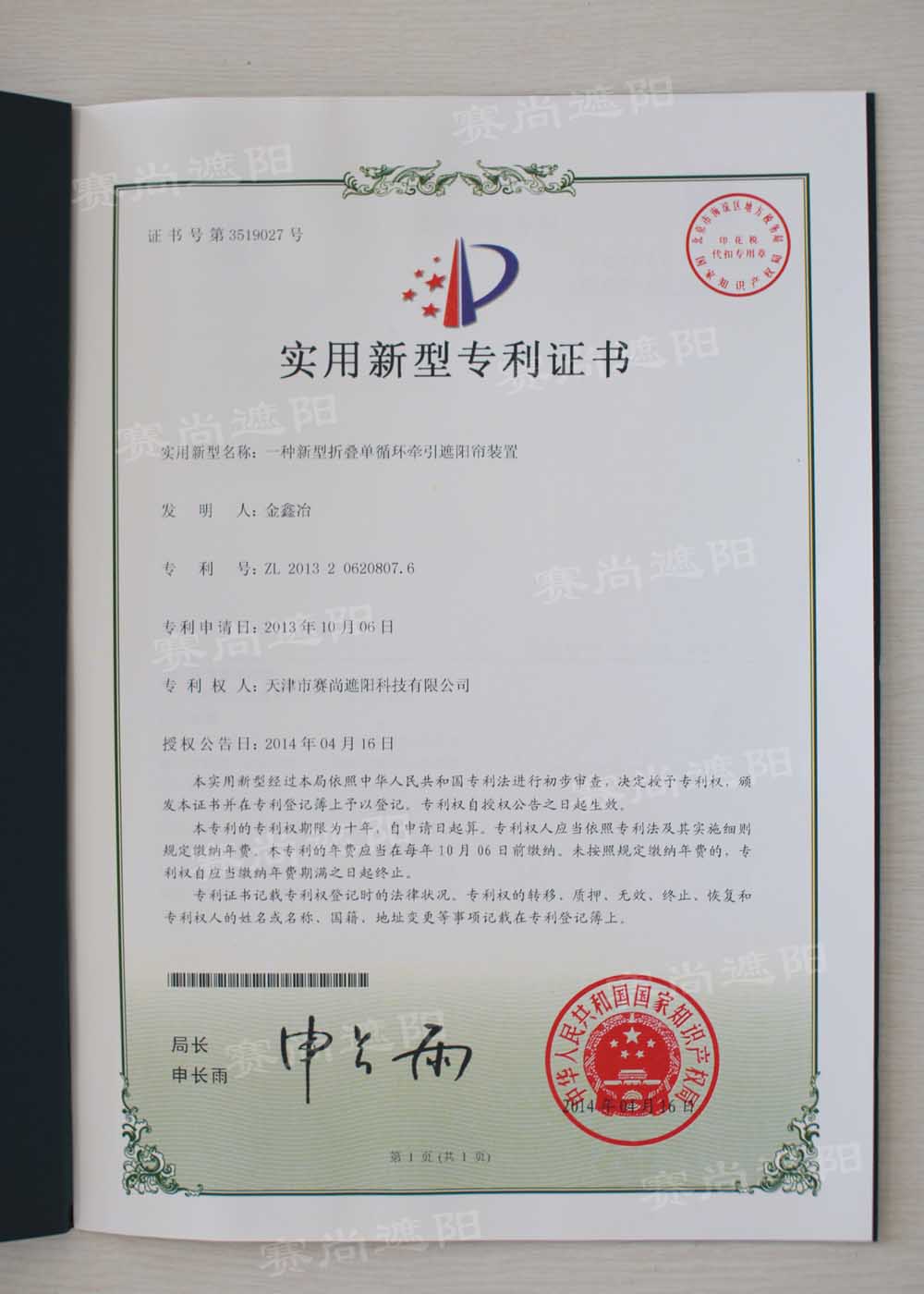 此項(xiàng)發(fā)明專利技術(shù)目前尚未應(yīng)用于公司產(chǎn)品,新專利的取得不會(huì)對(duì)公司目前經(jīng)營(yíng)產(chǎn)生重大影響,但有利于發(fā)揮公司的自主知識(shí)產(chǎn)權(quán)優(yōu)勢(shì)和完善知識(shí)產(chǎn)權(quán)保護(hù)體系,有利于增強(qiáng)公司的核心競(jìng)爭(zhēng)力。天津市賽尚遮陽科技有限公司作為天津市創(chuàng)新型企業(yè),在科技研發(fā)的道路上始終孜孜不倦地摸索著。多年來,企業(yè)以獨(dú)特的眼光、超前的意識(shí),積極實(shí)施品牌戰(zhàn)略,努力樹立企業(yè)形象。展望未來,賽尚將一如既往地為您提供全方位的遮陽解決方案,您的舒適生活賽尚愿和您共同構(gòu)建。