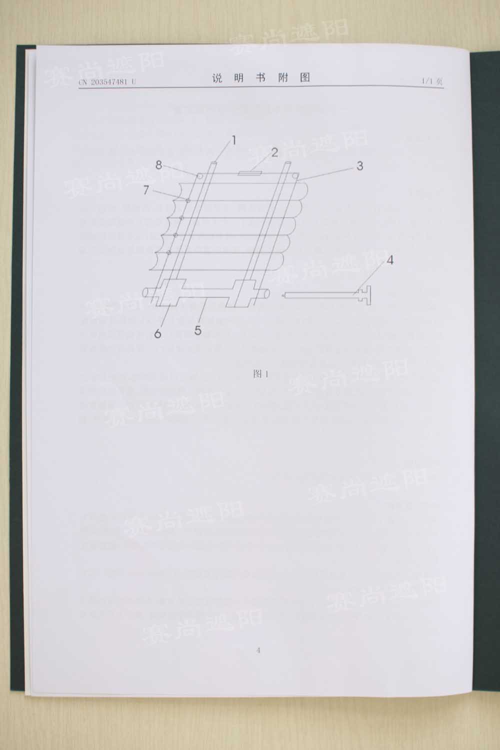 本實(shí)用新型的有益效果為;使用簡(jiǎn)單,手段多樣化,既可以用無線電、紅外控制也可以手動(dòng)及群控、智能等方式控制。此外,該裝置應(yīng)用非常廣泛,適合各種大型遮陽場(chǎng)所,既可以起到調(diào)光遮陽、柔和進(jìn)入室內(nèi)的光線,也可以起到保持室內(nèi)溫度、改善采光效應(yīng)等作用。從外觀上來看,本裝置典雅大方,層次感分明,符合大部分人的審美觀,在起到遮陽作用的同時(shí),還可以增加美感,愉悅?cè)诵摹?br />3、技術(shù)聲明