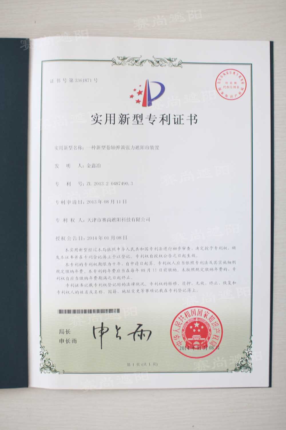 2014年1月8日,天津市賽尚遮陽(yáng)科技有限公司一項(xiàng)由公司總經(jīng)理金鑫冶先生發(fā)明的專利正式通過(guò)了中華人民共和國(guó)國(guó)家知識(shí)產(chǎn)權(quán)局的審批。該專利類型為實(shí)用新型專利證書,其具體名稱是:一種新型卷軸彈簧張力遮陽(yáng)簾裝置,證書號(hào):3361871,專利號(hào):ZL 2013 2 0487490.3。此次專利申請(qǐng)近半年,專利順利獲批也標(biāo)志著我公司的科技研發(fā)水平往上又邁了一個(gè)新的臺(tái)階,這也將大大提升我公司的市場(chǎng)核心競(jìng)爭(zhēng)力。下面是此項(xiàng)證書的內(nèi)容介紹: