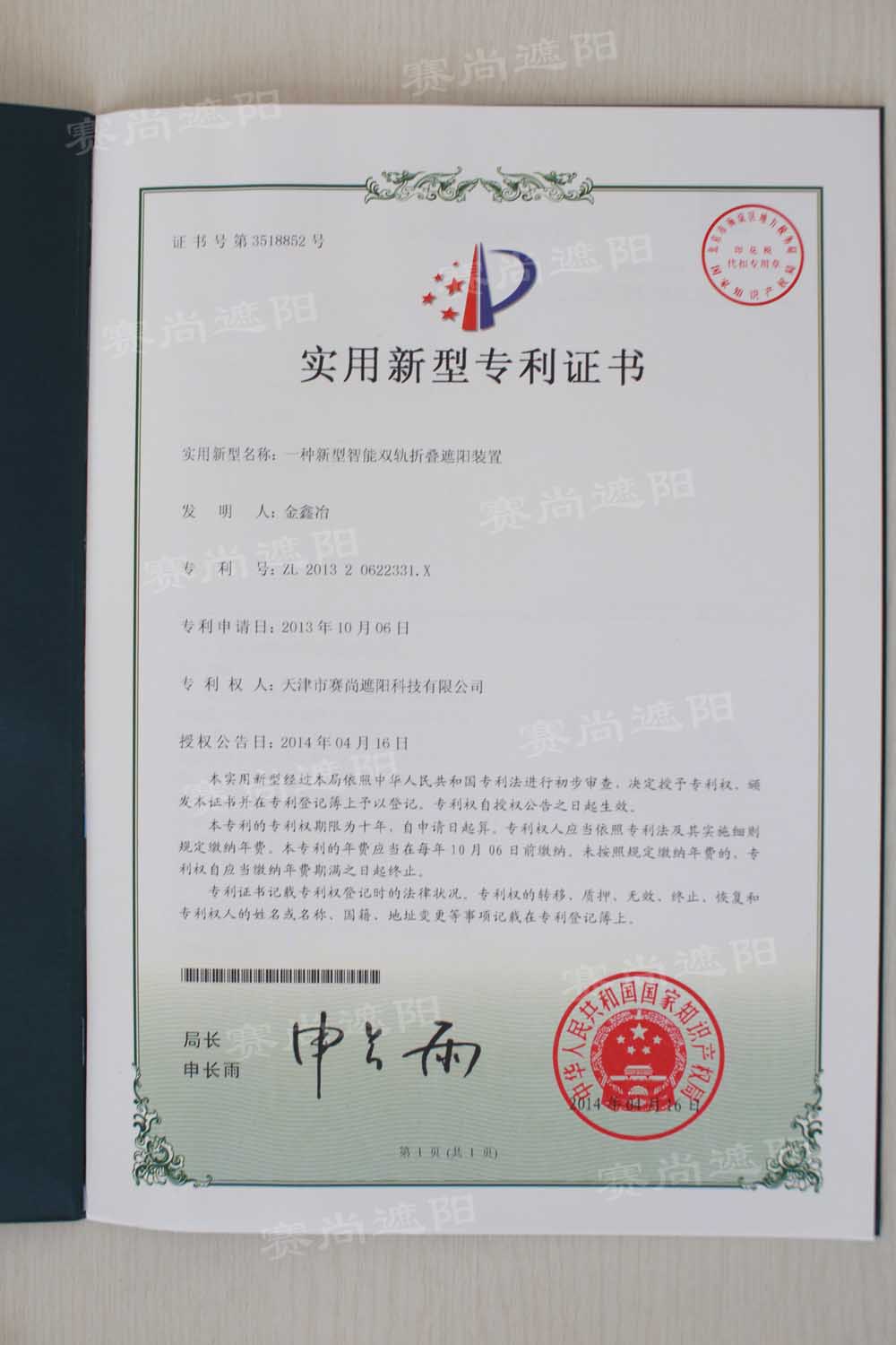 2014年4月16日,天津市賽尚遮陽(yáng)科技有限公司一項(xiàng)由公司總經(jīng)理金鑫冶先生發(fā)明的專利正式通過(guò)了中華人民共和國(guó)國(guó)家知識(shí)產(chǎn)權(quán)局的審批。該專利類型為實(shí)用新型專利證書(shū),其具體名稱是:一種新型智能雙軌折疊遮陽(yáng)裝置,證書(shū)號(hào):3518852,專利號(hào):ZL 2013 2 0622331.X。此次專利申請(qǐng)近半年,專利順利獲批也標(biāo)志著我公司的科技研發(fā)水平往上又邁了一個(gè)新的臺(tái)階,這也將大大提升我公司的市場(chǎng)核心競(jìng)爭(zhēng)力。下面是此項(xiàng)證書(shū)的內(nèi)容介紹: