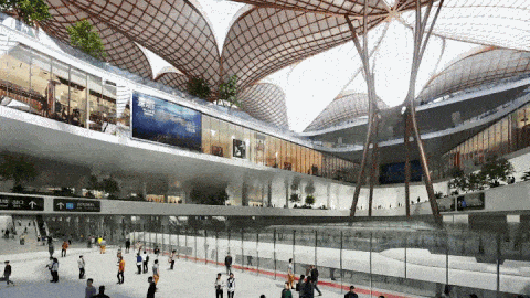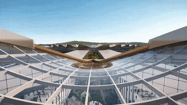 不論是靜景還是動(dòng)畫,都讓我們仿佛置身于現(xiàn)實(shí)世界的樞紐建筑中:在流線屋頂結(jié)構(gòu)的引導(dǎo)下,一路追逐著灑下的溫暖日光,循著沿途的生態(tài)景觀,奔赴一場愉悅與舒心的旅程。