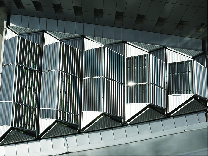 電動(dòng)梭形百葉常應(yīng)用于采光頂外部遮陽,隔熱效果很好,其葉片尺寸可定制,在0-110度范圍內(nèi)任意角度翻轉(zhuǎn),通過葉片的翻轉(zhuǎn)實(shí)現(xiàn)調(diào)光,保持室內(nèi)光熱舒適性,可以遮擋太陽輻射高達(dá)80%,可節(jié)約30%以上的空調(diào)及其他相關(guān)的遮陽、采光設(shè)備造成的能耗費(fèi)用。