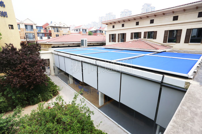 案例二:天津黑鯊運(yùn)動(dòng)成長(zhǎng)中心為一家少兒運(yùn)動(dòng)中心,其建筑對(duì)于室內(nèi)環(huán)境的要求很嚴(yán)格,對(duì)于室內(nèi)光熱環(huán)境的舒適性很敏感。介于此,賽尚遮陽(yáng)為天津黑鯊運(yùn)動(dòng)成長(zhǎng)中心立面玻璃窗及頂部采光頂定制性價(jià)比高的戶外鋼索卷簾和電動(dòng)天幕作為此中心外遮陽(yáng)調(diào)光設(shè)施,戶外卷簾和天幕不但遮陽(yáng)隔熱效果更好,而且產(chǎn)品安裝于室外可為室內(nèi)節(jié)省大大的空間。