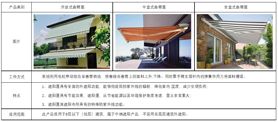 遮陽篷是采用卷取方式使軟性材質(zhì)的簾布向下傾斜與小平面夾角在0°~15°范圍內(nèi)伸展、收回的遮陽裝置,是優(yōu)良的外遮陽制品。遮陽篷包括開放式曲臂蓬、半盒式曲臂蓬、全盒式曲臂蓬。