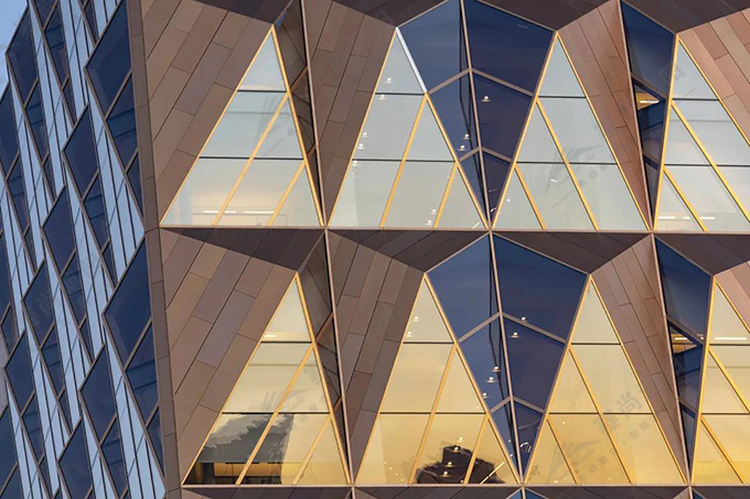 RCC(Russian Copper Company)是世界領(lǐng)先的銅生產(chǎn)商之一,設(shè)計(jì)中采用的三角形形式便是從銅的化學(xué)結(jié)構(gòu)中獲取靈感。建筑的冠部結(jié)合了RCC的新標(biāo)識(shí),后者的設(shè)計(jì)同樣也受到了建筑的啟發(fā)而設(shè)計(jì)遮陽方案。