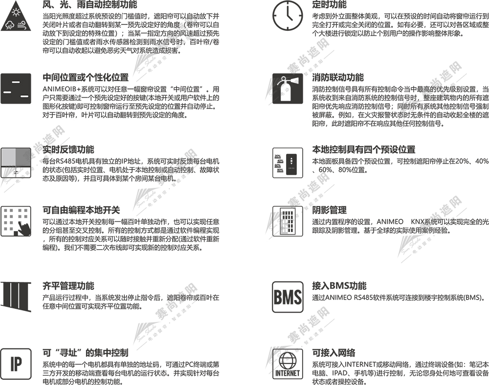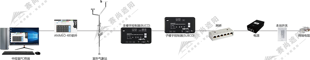 使用者可以通過(guò)接入數(shù)字化網(wǎng)絡(luò)(如互聯(lián)網(wǎng)、RS485網(wǎng)絡(luò)等)的電腦或觸屏設(shè)備對(duì)遮陽(yáng)產(chǎn)品進(jìn)行控制。遮陽(yáng)系統(tǒng)也可以通過(guò)網(wǎng)絡(luò)與建筑中的其它系統(tǒng)如空調(diào)、照明等系統(tǒng)進(jìn)行結(jié)合,通過(guò)對(duì)遮陽(yáng)產(chǎn)品的精確控制,實(shí)現(xiàn)更佳的節(jié)能效果。