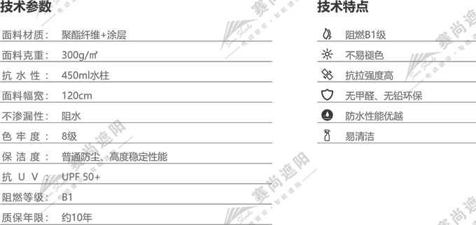 遮陽(yáng)篷應(yīng)用于室外,故我們選擇面料是需考慮其防水性能、色牢度等因素。可采用腈綸纖維或原液亞克力等材料,其抗水性能及日照色牢度等性能相對(duì)較好?;臼褂弥芷?0年左右。