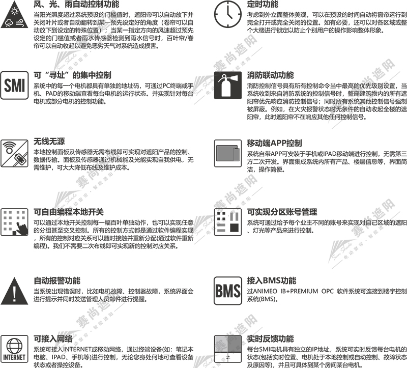 標(biāo)準(zhǔn)電機(jī)接口(STANDARD MOTOR INTERFACE)是遮陽卷簾/百葉窗和驅(qū)動器的標(biāo)準(zhǔn)電氣接口。SMI可以將傳動裝置連接到集成的電子電路,以應(yīng)用于遮陽卷簾/百葉窗系統(tǒng)。歐洲生產(chǎn)商已經(jīng)聯(lián)合成立SMI工作組,以開發(fā)數(shù)字電機(jī)接口。通過標(biāo)準(zhǔn)化的接口,控制指令和報文可以精確控制驅(qū)動器。根據(jù)應(yīng)用,最多可以并列控制16個驅(qū)動器。通過帶電源和數(shù)據(jù)傳輸?shù)奈寰€線路連接的控制器和驅(qū)動器,實(shí)時位置精度高、當(dāng)前電機(jī)位置查詢、帶診斷信息的電機(jī)反饋。