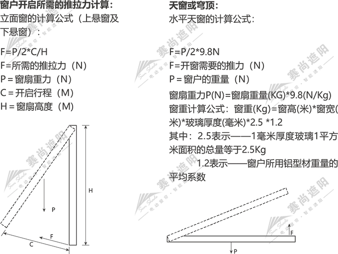 當(dāng)窗戶需要與消防聯(lián)動時,需要考慮作用在窗體上荷載,請聯(lián)絡(luò)公司技術(shù)人員進(jìn)行進(jìn)一步的計算開窗所需的推力,以便選擇適當(dāng)推力的開窗器。當(dāng)窗戶的寬度大于1200mm時,開窗至少需要2個推點,2只開窗器需要配置電子同步器,以確保窗體不變形,不被損壞。窗戶的高度至少是選擇開窗器行程的2倍。